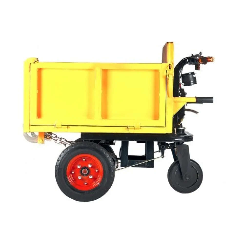 По принципу действия техника напоминает тачку и выполняет его функции. При этом управление намного проще и функциональнее. При мощности двигателя 900 Вт и емком АКБ тс способно развивать скорость до 8 км/час и преодолевать достаточное для полноценного рабочего дня расстояние.