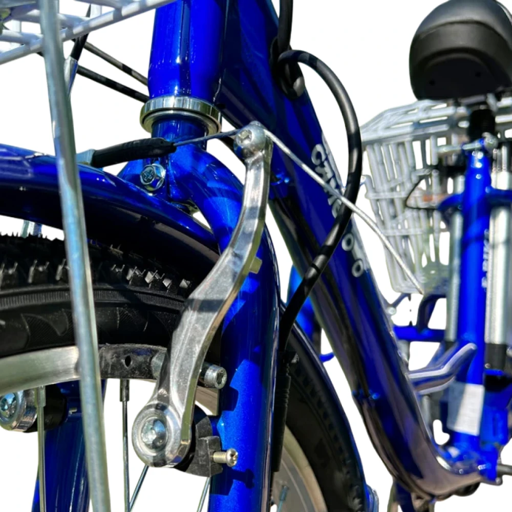 Мотор BLDC 350 Вт (переднее мотор-колесо): Разгон до 25 км/ч, подъём 15% под нагрузкой — уверенно на холмах. АКБ литиевый NMC 48V 12Ah: 576 Вт·ч, заряд 7-8 ч (2A), реальный пробег 40 км (город 30 км, груз 20 км). 3 режима ассистента: эконом (20 км/ч, 40 км), стандарт (25 км/ч, 30 км), мощный (25 км/ч, 25 км). V-brake спереди + диск сзади — тормозной путь 4 м. R24 шины — энергоэффективны на асфальте.