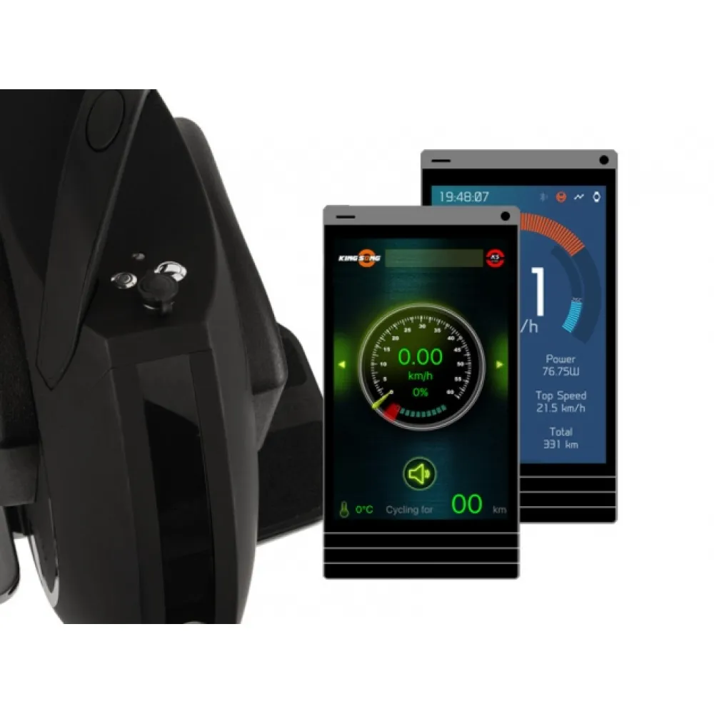 Моноколесо KingSong 16S имеет яркую переднюю фару, сзади габаритные огни. По боковым сторонам встроенная светодиодная подсветка, которую можно регулировать с помощью приложения, установленного на смартфон, в нем же можно отслеживать основные показатели устройства.
